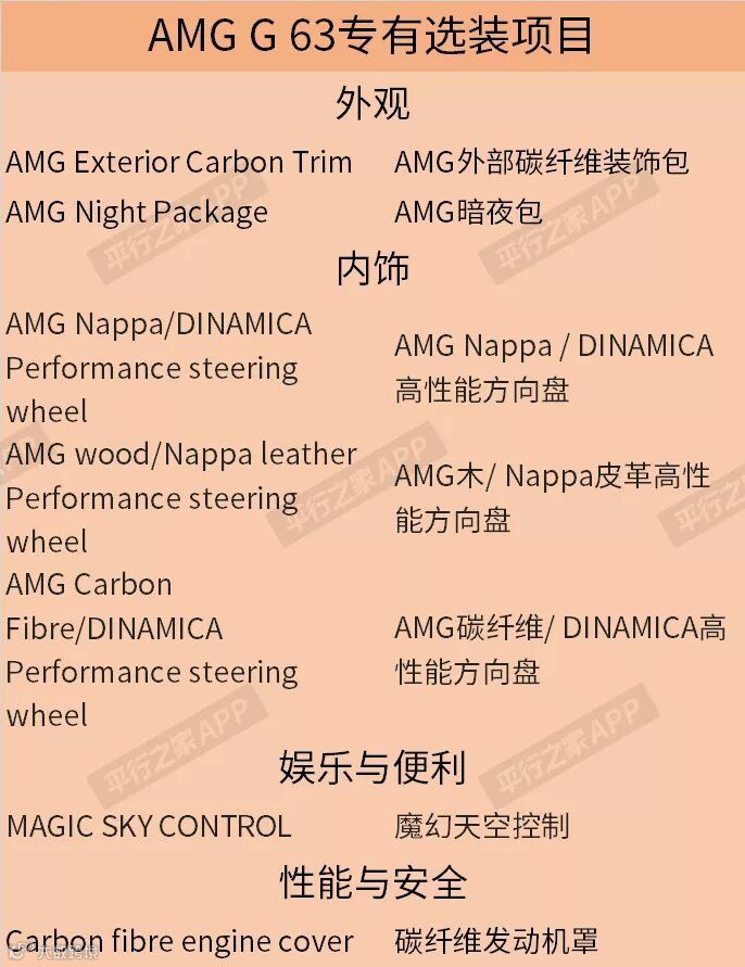 以上基础配置和选装包均为普通版奔驰S级的项目,AMG S 63与上述有所不同,除了发动机以外,AMG S 63在外观、内饰、功能配置、选装包等方面与普通版奔驰S级也有所不同。AMG S 63多出了外观碳纤维包和暗夜包,以及AMG方向盘和碳纤维发动机罩,魔幻天空控制其实是奔驰专有的一种可变式天窗功能,通过深浅两种颜色切换,控制太阳光照射量,从而控制车内温度。普通奔驰S级的选装项目:空气平衡套餐、抬头显示、智能驱动包都成了AMG S 63的基础配置。