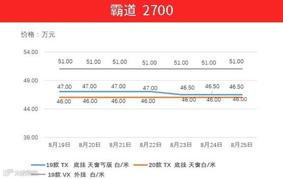 霸道4000的强劲动力不是2700可以媲美的,4000也是消费者除酷路泽之外最喜爱的丰田产品。上周19款TXL车型保持不变,20款VX 外挂 丝绒车型上升5000元。