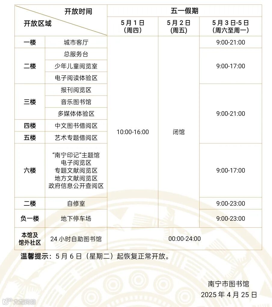 根据国务院办公厅《关于2025年部分节假日安排的通知》精神,结合我馆实际,现将2025年五一假期开放安排的有关事项通知如下: