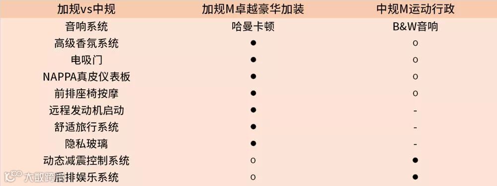 真正与加规M运动大豪华型产生价格碰撞的是M运动尊享型,指导价108.8万元,加价后在120万元左右,两者之间的配置差别,可参考下表