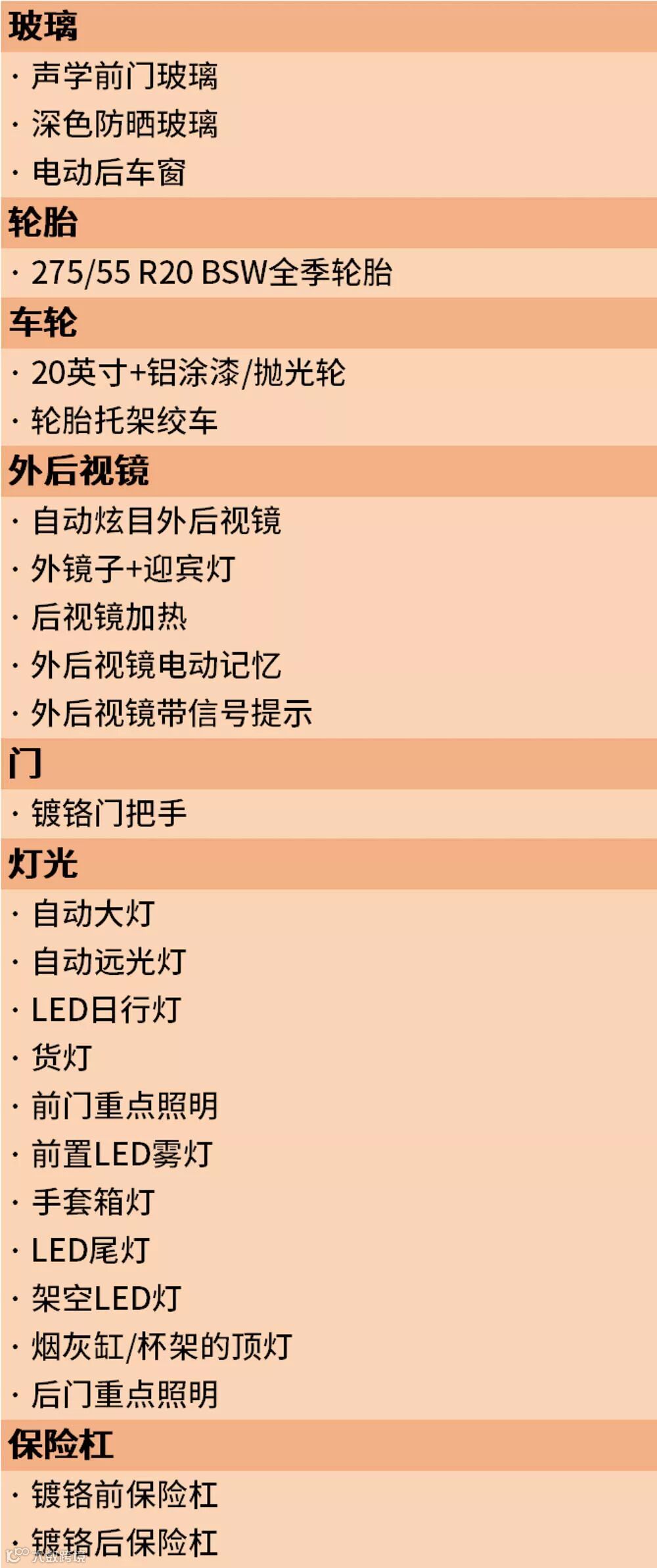 标配20寸轮毂搭配275/55 R20的轮胎,官网有两种轮毂样式可以选择,一个是20寸,另外一个是22寸(22寸所搭配的是285/45 R22的全季轮胎),无论是哪一款都很霸气,车商一般引进的是第一款20寸的。