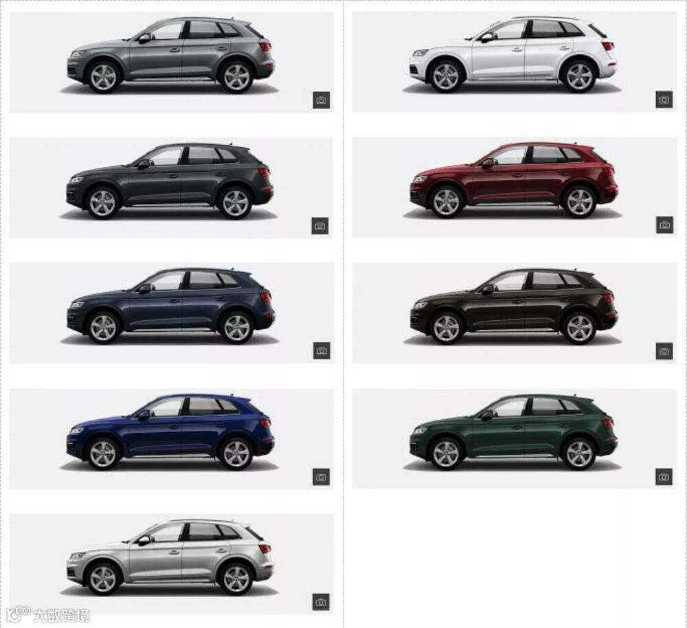普通颜色颜色多达十三种,其中,灰色的珍珠金属漆还需要加价。另外还有奥迪独家颜色可以选择(金属效果的有:棕色金属柚木、米色Karat金属色。珍珠效果的有:黑樱桃珍珠效果、米色砂珍珠效果)选装需要57950墨西哥元,合约人民币20448。