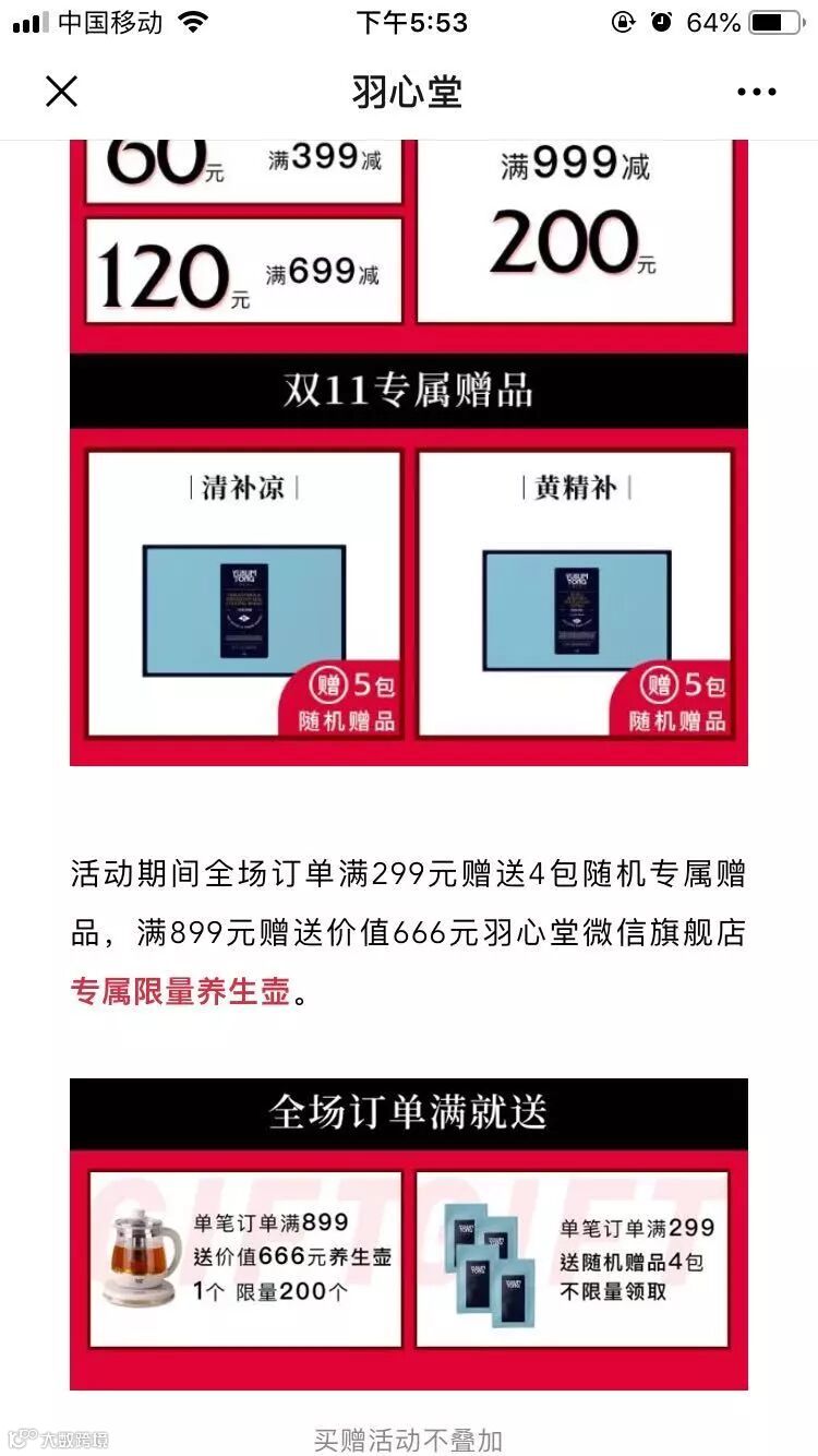 2. 通过满减送²,提升客单价,促进增购。如 11.11 期间,羽心堂设置了梯度满减优惠,消费满 399 减 60 ,满 699 减 120 ,满 999 减 200 。满 899 元还额外赠送限量养生壶,大大促进客户增购。