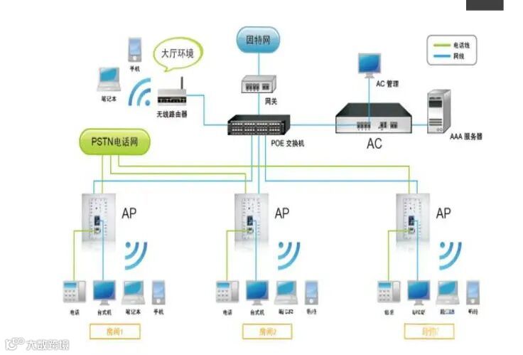 AC+AP架构:1台AC控制器 + 多个吸顶式AP,支持无缝漫游。