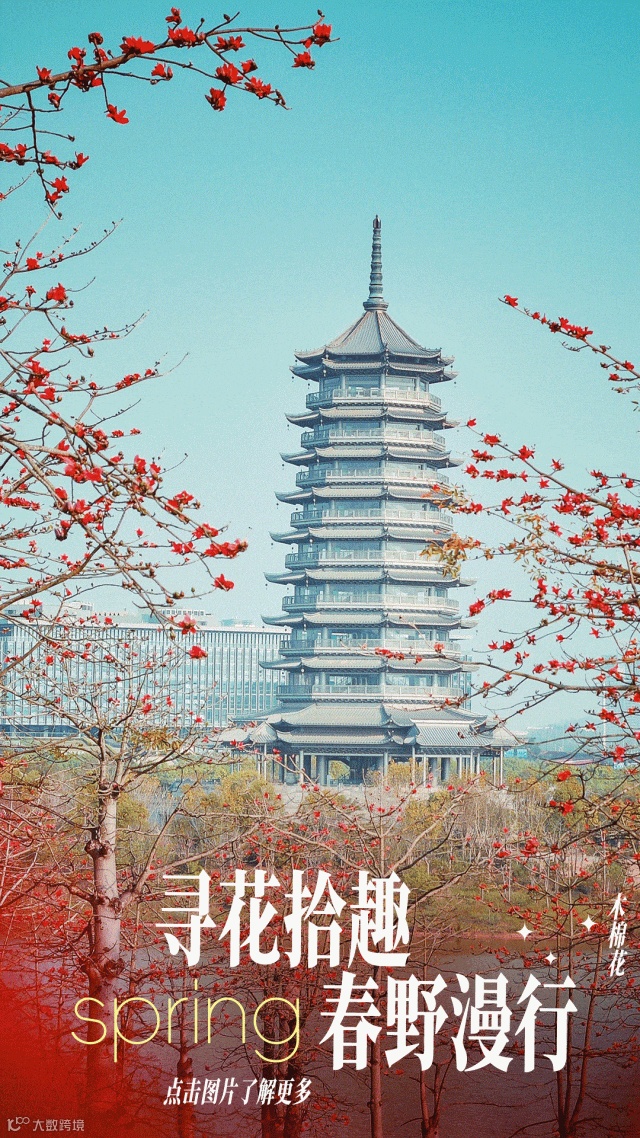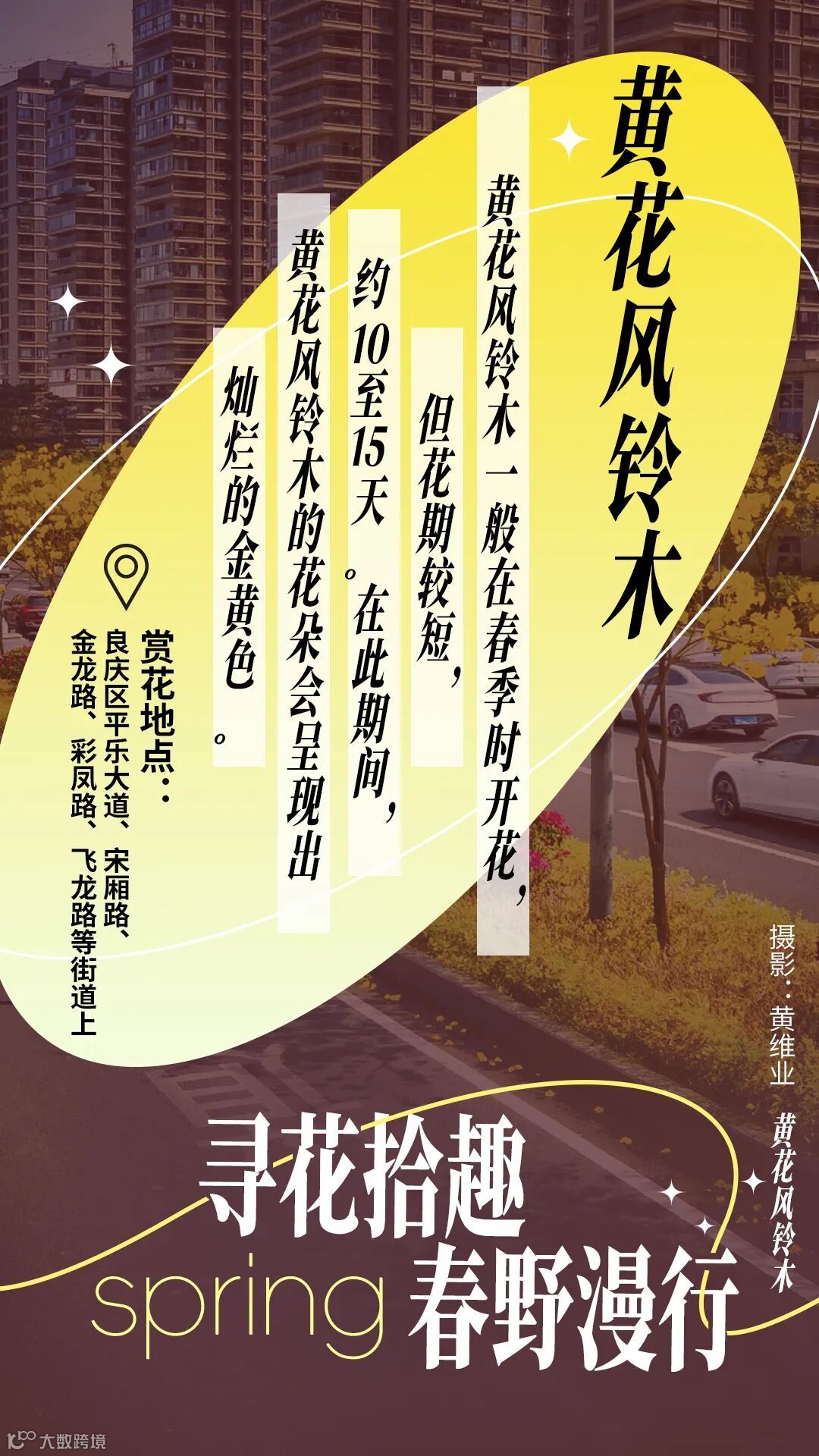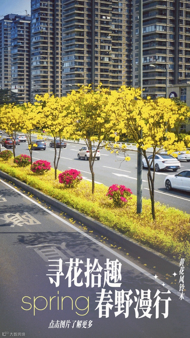 良庆区的黄花风铃木多种植在道路两旁,与现代城市景观十分相配,可采用航拍视角拍摄城市风光大景图片,若有蓝天白云景色更佳。