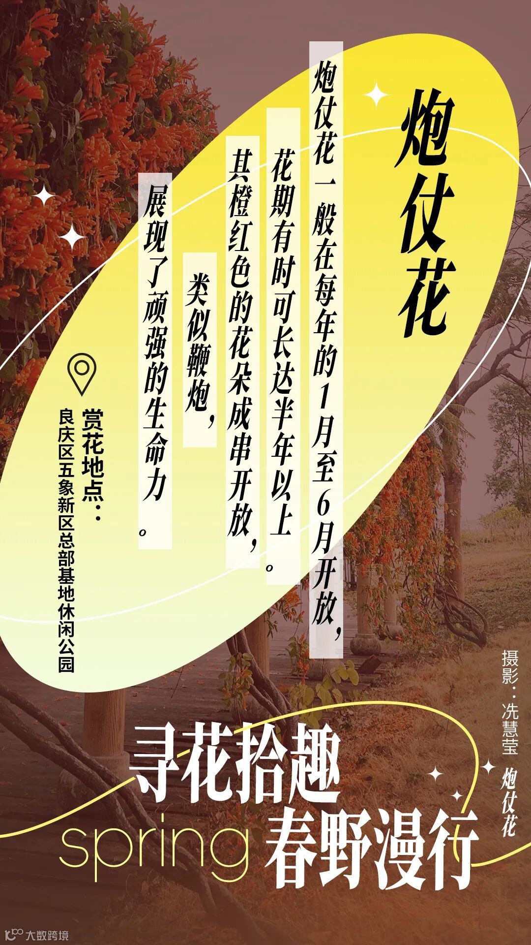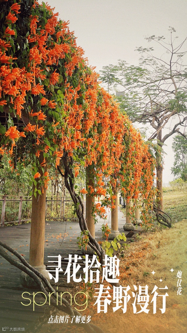 2.拍摄人像:着装上,建议穿着浅色系衣服、长裙,与炮仗花的橙红色形成对比,拍照更易出片。道具可佩戴有氛围感的草帽、书本、地上掉落的花瓣等,更具氛围感~若炮仗花的花藤太高,可带一个便携的折叠椅子或梯子,让模特站上更高的位置拍摄。
