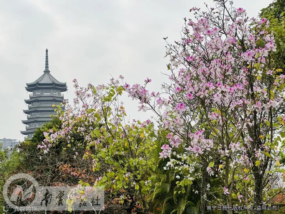 可站在南宁之夜南门外的人行天桥上寻找角度,拍摄道路街景,或者以背后的紫荆花为背景拍摄人像,也可将紫荆花与远处五象湖公园的五象塔合照,都能获得不错的照片。
