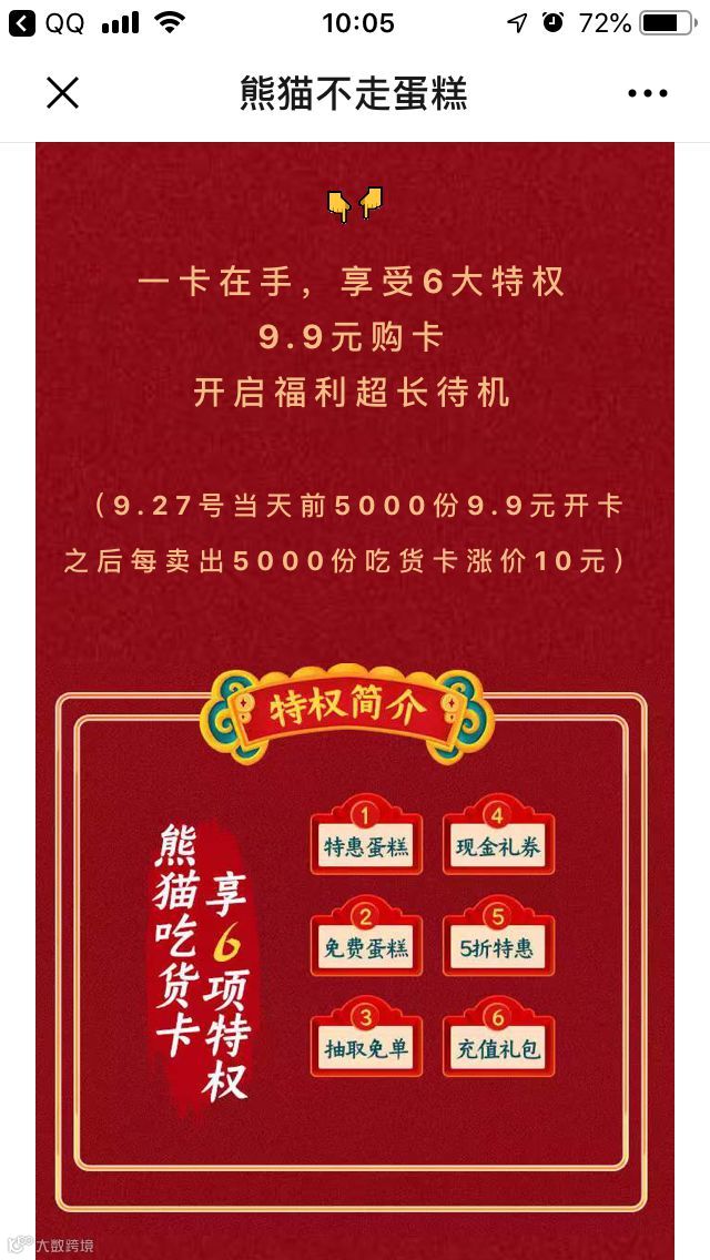 1. 结合秒杀¹工具,发放低价特权卡。如:9 月 27 日当天推出「熊猫吃货卡」,用 9.9 元购卡享受价值数百元的多项特权,并限量发放 5000 份作为噱头,其中的巨额优惠引来了大批流量: