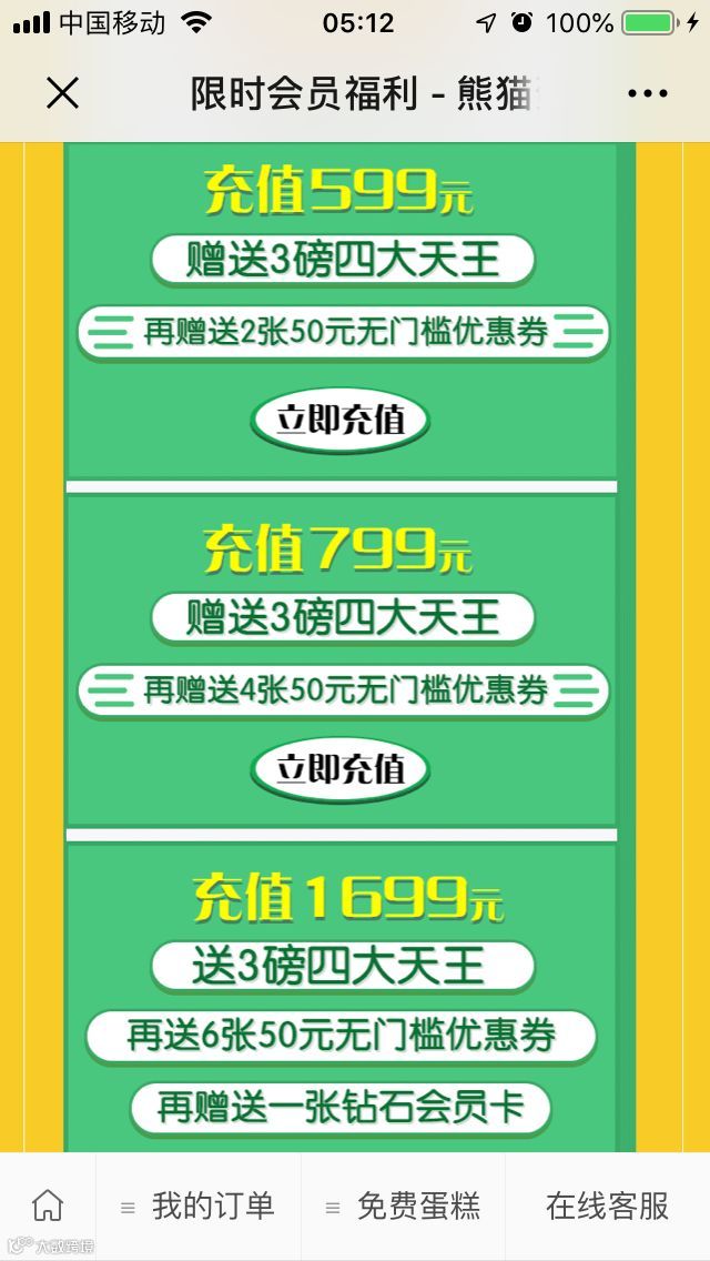 ③ 充值 1699 元,赠 3 磅四大天王、6 张 50 元优惠券、1 张钻石会员卡,外加全场正价蛋糕 9 折。