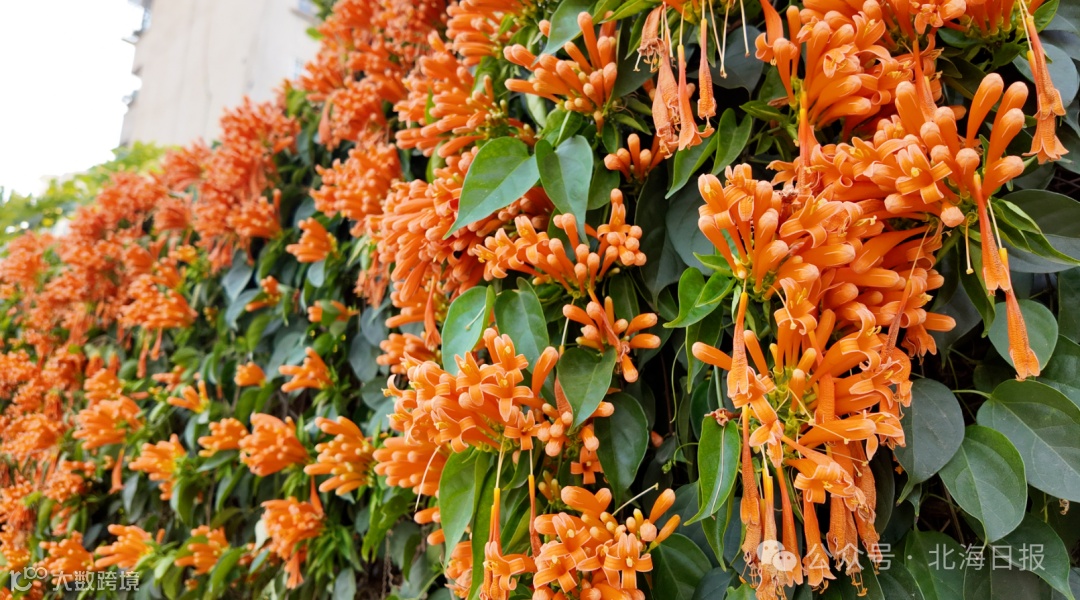 北海云南路、嘉华路等街道的炮仗花应景盛开。喜庆的颜色挂满枝头,密密匝匝从围墙倾泻而下,煞是惹眼。