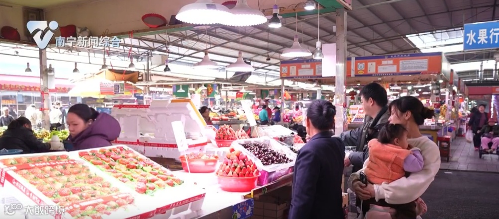 在淡村商贸市场水果行,各类红橙黄绿的冬季水果散发出令人愉悦的果香,一个个细茎翠绿、果肉饱满、脆甜多汁的车厘子也被摆放在显眼位置,并以称斤和精装礼盒的方式销售,供顾客挑选。