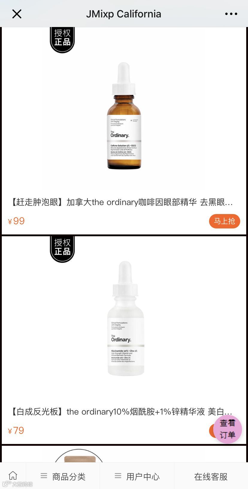 即魅店铺目前主要绑定“JMIXP即魅”和“蓓佳”两个微信公众号,平时为用户推送商品、活动消息。此外,品牌还申请了2个美妆公众号,用作新品测试,目前单个号粉丝在2万人左右。每一款新品在正式上架销售前,都会先通过测试号推送一波。据了解,The Ordinary咖啡因眼部精华在测试期的复购率为74%,目前在店铺以新品限时折扣¹出售,上线当月销量就超过1万单。