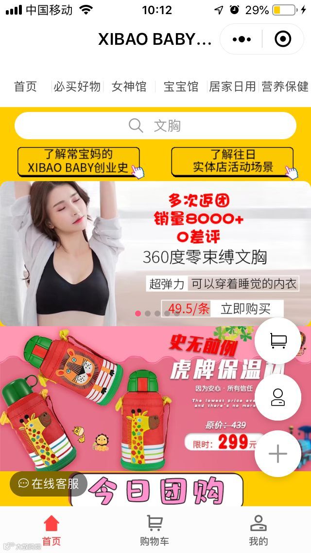 2017 年,常宝&牛奶妈开通了有赞微商城服务,将新的线上店铺取名为「XIBAO BABY严选商城」。对于新店铺的运营,常宝&牛奶妈以小程序、限时折扣为主稳定老客户,再以满减送活动进行拉新: