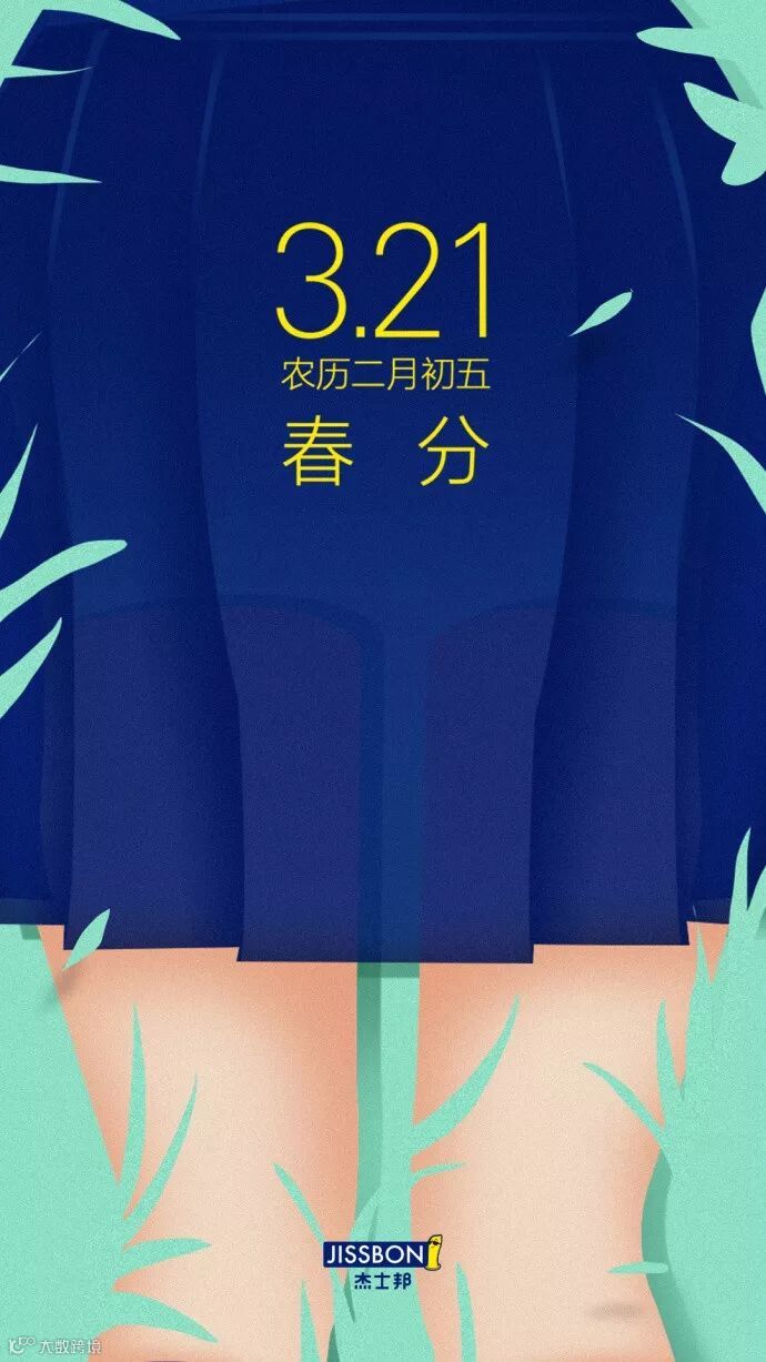 画面中姑娘的裙摆、两条分开的大白腿,与“春分”相呼应,321,123。万物复苏,隔衣擦火,最撩人的莫过于那一抹裙底下的美妙幻想。