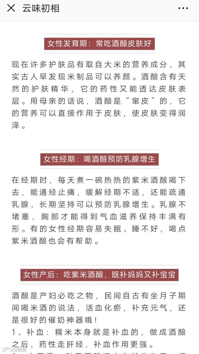 卖点提炼:在做产品文案时,云味初相发现如果把产品的卖点写得太宽泛,其实跟没有卖点是一样的,消费者并不会被吸引,要瞄准具体的需求点,让消费者直观地感受到产品的好处。拿一款紫米酒酿来说,这款产品起初在市场上主打“美容养颜”卖得非常不理想。而云味初相瞄准消费群体当中具体的需求点,提炼出“女性发育期护肤”、“女性经期预防乳腺增生”、“女性产后妈妈宝宝一起补”三个卖点,对应女性不同的养生阶段,达到了1周10000瓶的销量。