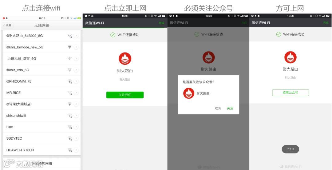 WiFi增粉原理:当用户在商场、咖啡厅餐厅、健身房等场所使用公共WiFi上网时,就会提示关注公众号,从而给微信公众号简单高效地增粉,每月通过小博无线联网的用户超过5000万。