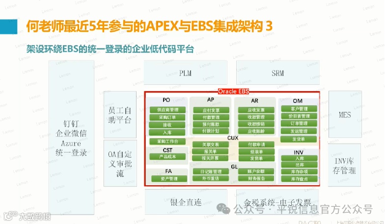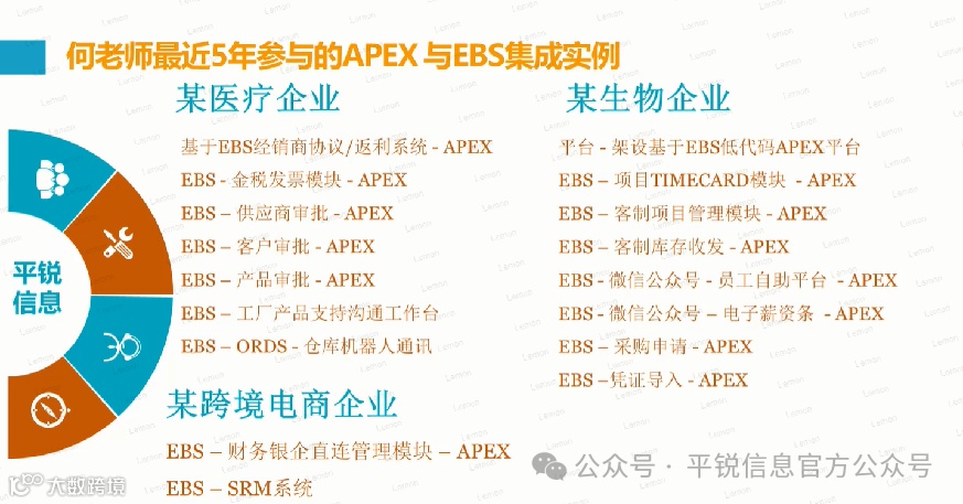 何老师还分享了APEX另一重要商业应用,老树发新芽,APEX协助EBS延展应用。