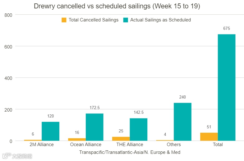 在接下来的五周内,THE联盟已宣布取消高达25个航次,其次是海洋联盟和2M联盟,分别取消了16个航次和6个航次。