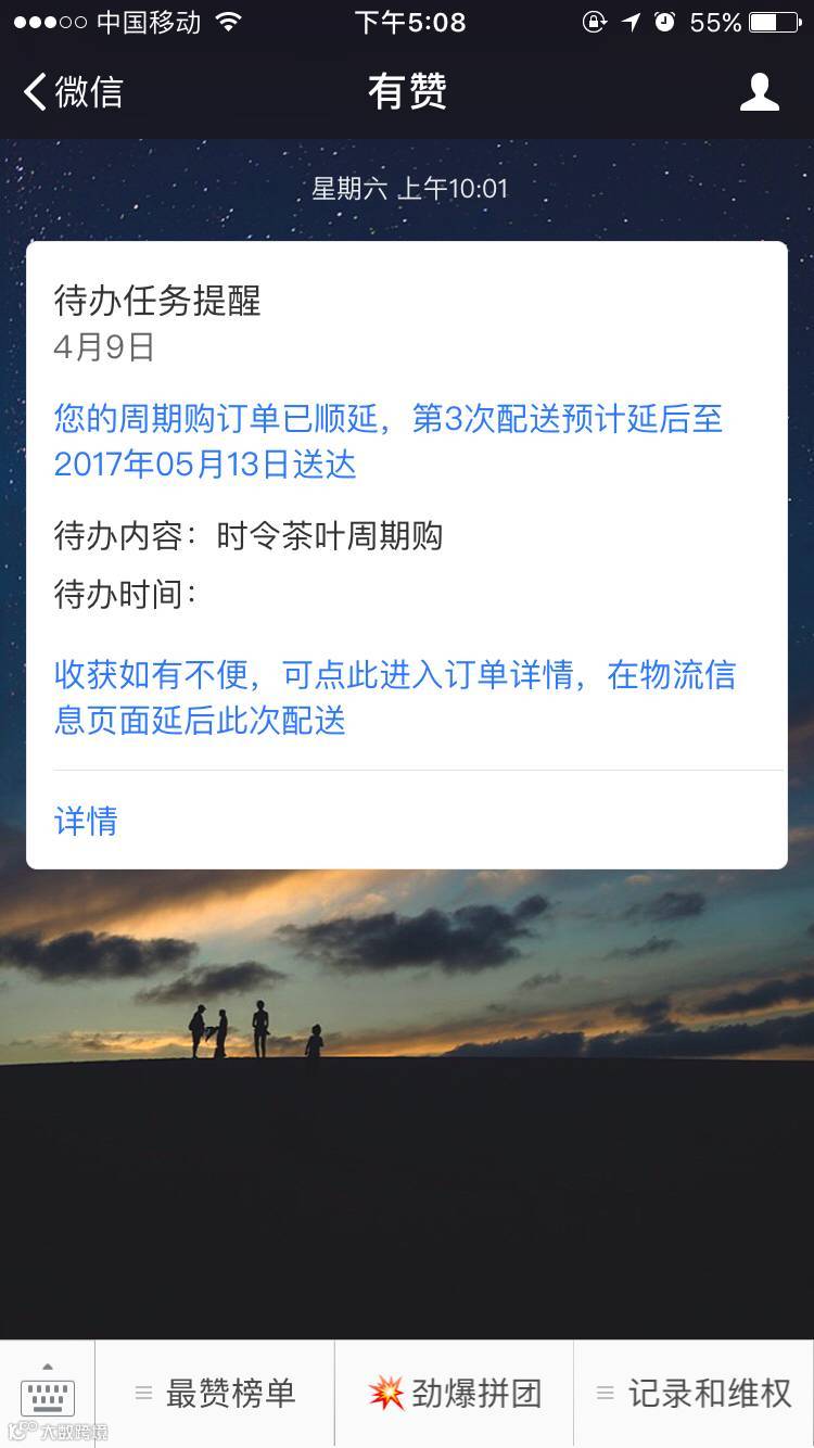 ● 每期的下单时间前12小时,系统会给买家发送微信模版消息,让买家确定是否要顺延配送;