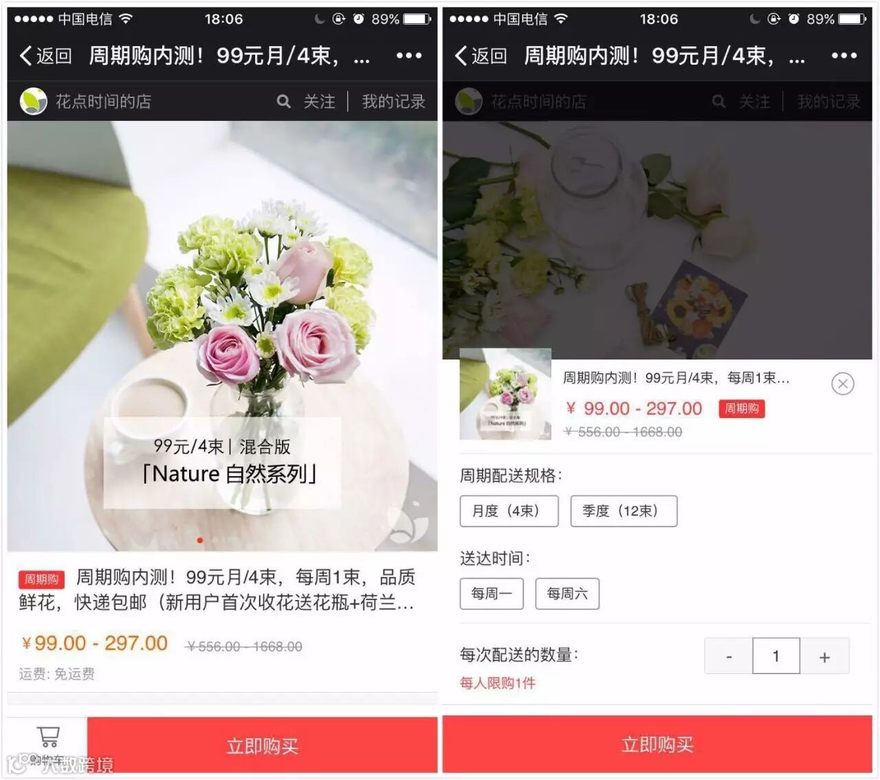 花点时间针对都市白领女性的社交、消费习惯,将主战场设立在微信公众号和有赞店铺,以“预购+周期购”每周一花(99元/月起,每月4束)的包月形式为主,一周一束特定花材,并用一句简短的文字赋予它特别的意义,让本身就带些浪漫色彩的消费行为看起来更具文艺色彩。花点时间于2015年10月正式上线,目前业务已覆盖全国28个省会,累计为五百万用户提供每周一花服务。