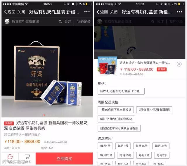 “周期订奶”本就是大家习以为常的的消费方式,这次“熊猫有礼”把它从线下搬到了线上。每月一箱奶,每月固定时间配送。避免了一次性囤货不新鲜、存放不便、快递重的难题,把老路子玩出了新体验。