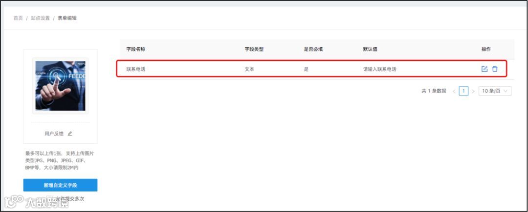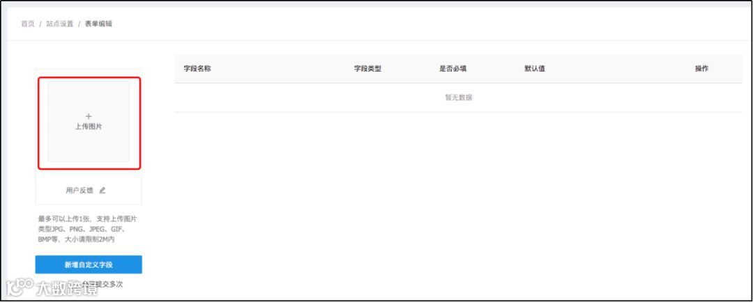 4) 进入表单编辑页面后,主要有三个操作项:上传表单封面图、修改表单名称和新增自定义字段。点击【上传图片】,先上传一张图片
