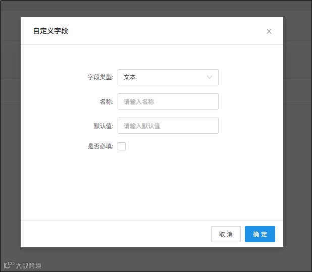 5) 点击【新增自定义字段】按钮,填选择【字段类型】、名称、默认值、是否必填,例如我想在用户反馈表单中让用户填写自己的联系电话,则我在此将字段类型选择为【文本】,名称为【联系电话】,默认值为【请输入联系电话】,是否必填勾选上,点击【确定】按钮