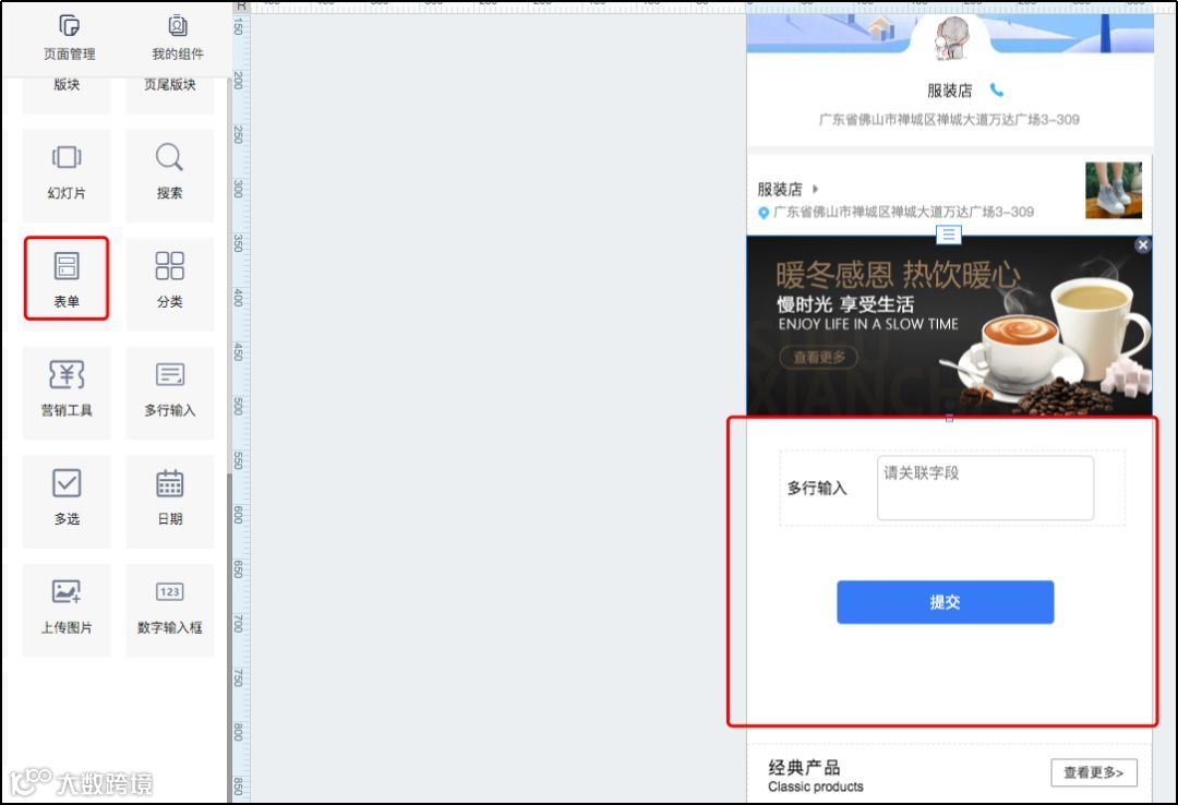 9) 在【组件库】下方选择到【表单】,拖动到店铺首页