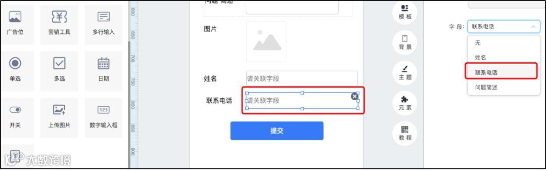 6) 这样生成了一个名称为【联系电话】的字段,显示在右上角的编辑页面。一个表单是由N个这样的字段组成的。