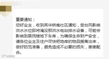 南宁圭贝社区、英华桥南社区等社区在小区业主群内发布通知,称洪水可能会影响到居民楼地下车库,请业主及住户尽快转移地库里的物品,避免造成不必要的损失。