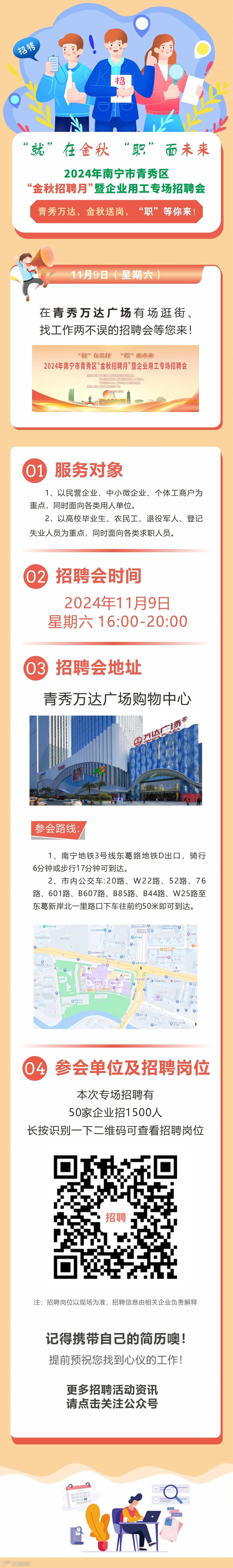 50家单位招1500多人!本周六,南宁青秀万达广场前有招聘夜市!