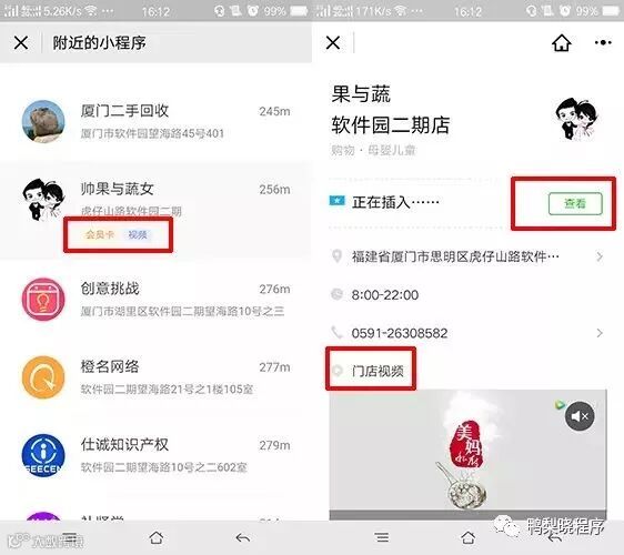 说到门店小程序,我们可以在“附近的小程序”中发现,一些支持用户领取会员卡,或者添加了视频展示的门店小程序在列表中都会显示“会员卡”和“视频”的字眼,直接点击领取就能将会员卡放入自己的“卡包”中。