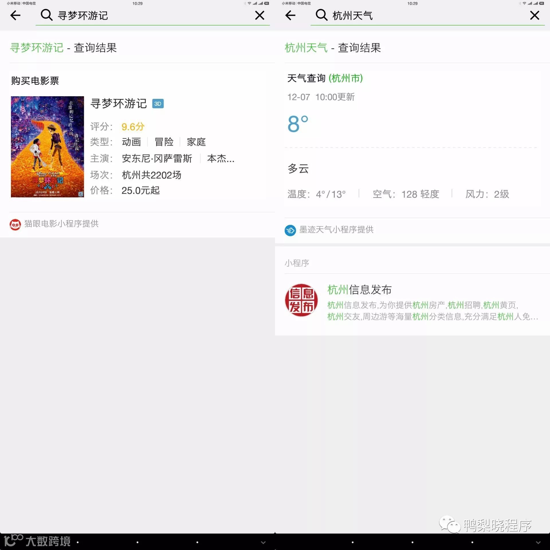 例如,搜索电影名称,可以搜到“猫眼电影”小程序提供的购票信息;搜索“地名+天气”,可以搜到“墨迹天气”小程序提供的天气信息等。
