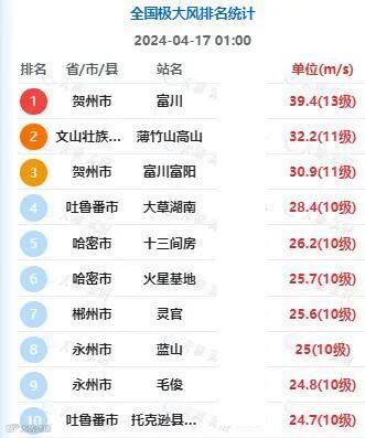 △2024年4月17日01时全国极大风排名统计