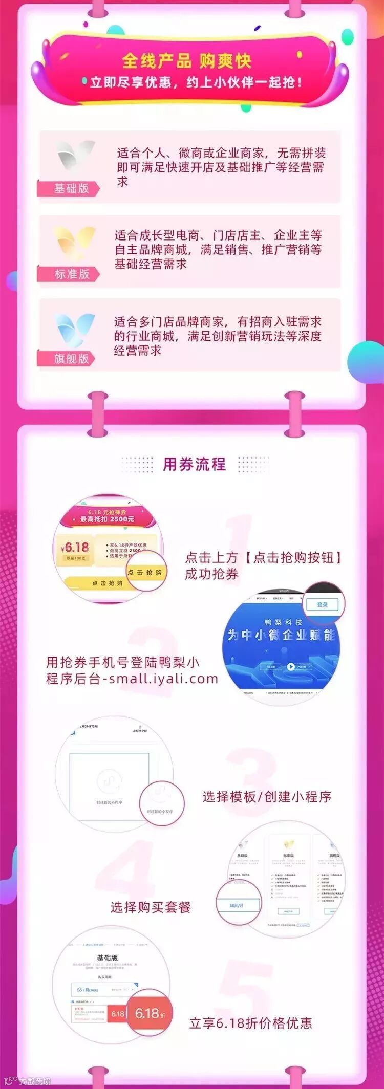 *即用户购买鸭梨小程序基础版、标准版或旗舰版任意一个版本,使用该活动优惠券,即可享受6.18折优惠(最高抵扣2500元);