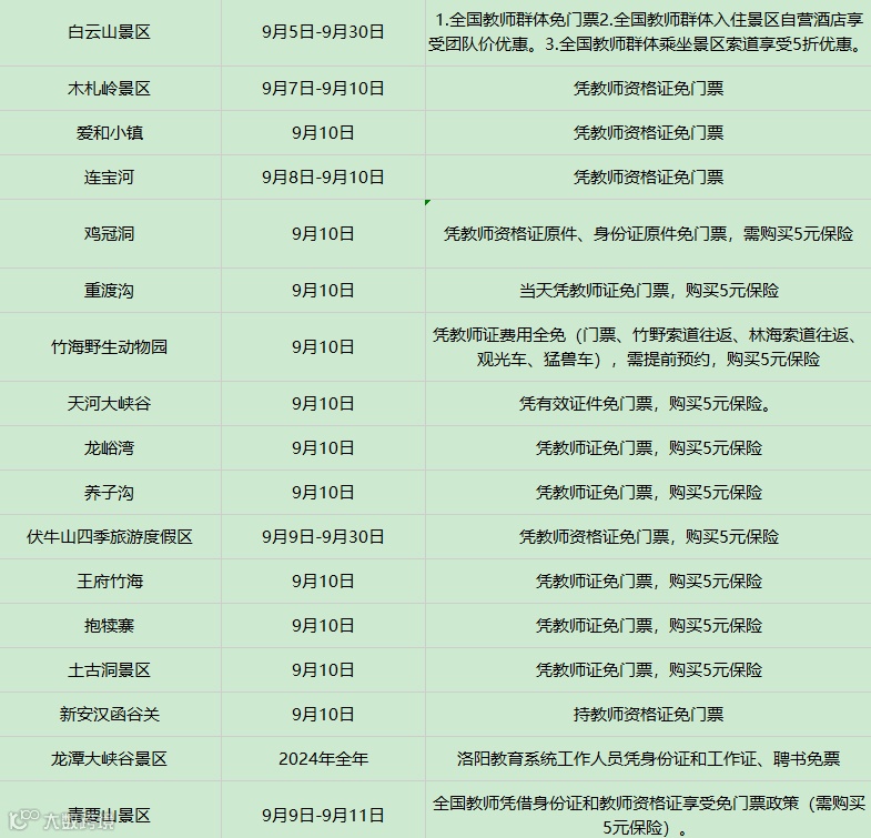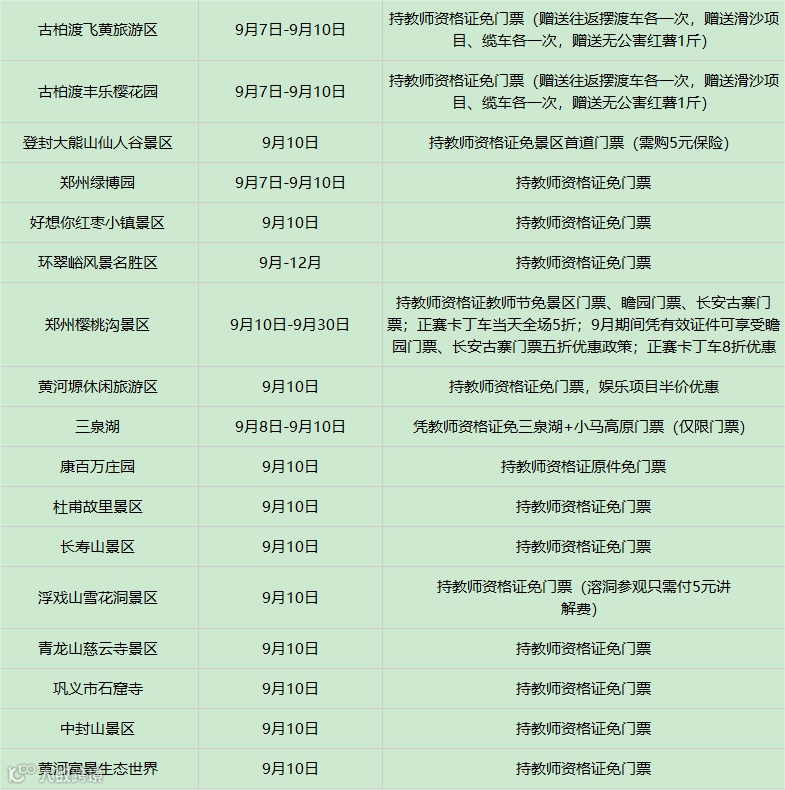 9月10日8:00至9月11日17:00止,持有效教师资格证件的全国大、中、小学及幼儿园等教师可免费游览以下景区: