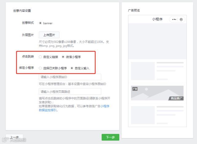 并且,广告外层暂时只支持“图片”展现形式,点击“图片”后可跳转至:小程序(指定路径)和H5外链(自定义)。