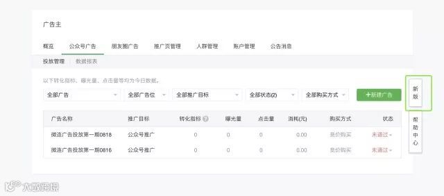 1、打开公众号后台(如果投小程序广告,请打开与小程序主体相同的公众号),点击广告主 - 公众号广告。