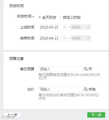注:每日预算有效范围为50.00-4,000,000.00元/天;单次点击出价有效范围为0.50-50.00元/点击