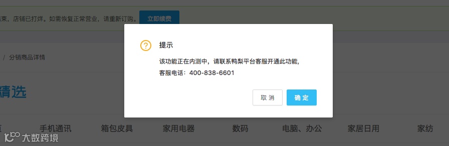 如果商家没有此功能的使用权限,则会弹出提示框,商家可拨打客服电话申请开通。