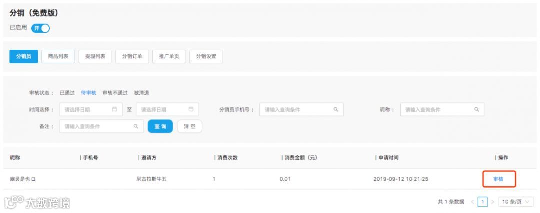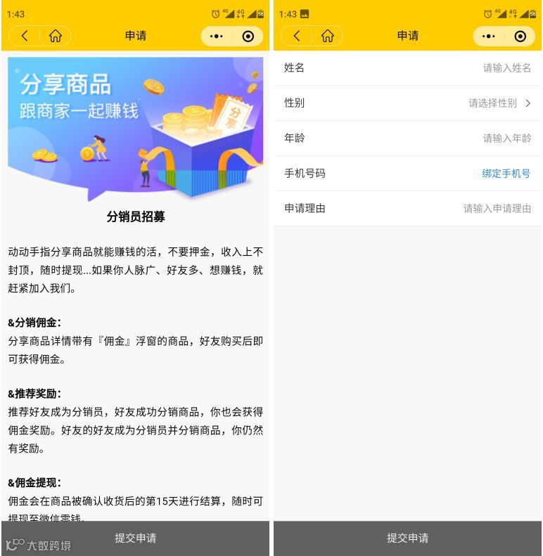 4.用户点击小程序『个人中心-分销中心』,可以看到推广单页,点击下方的『提交申请』按钮,补充相关资料。如果商家配置了分销员申请需要审核,则需在后台『分销员-待审核』模块进行审核处理。