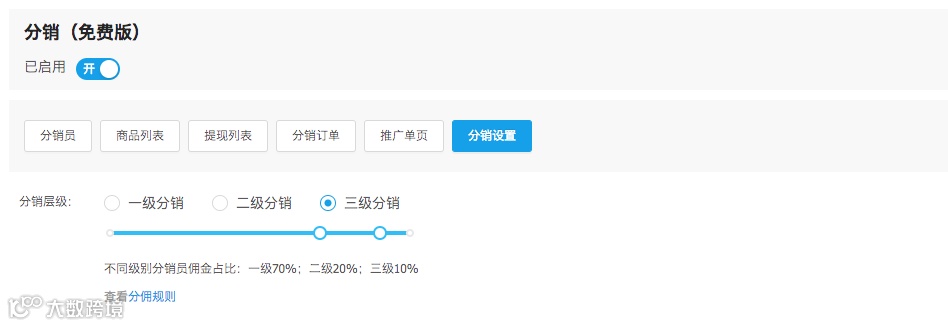 1.商家在『分销设置-分销层级』选择到三级分销,拖动下方的滑块设置好不同级别的分销员佣金占比。根据上方的栗子,我、甲、乙分别对应三级占比、二级占比、一级占比。