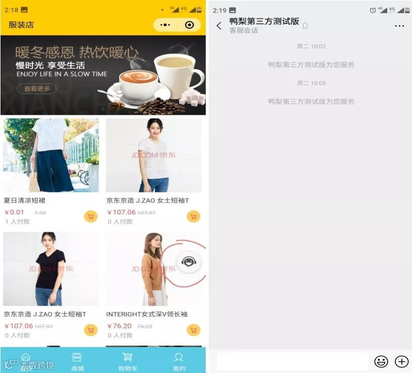 为了便于小程序用户能快速找到客服,我们增加了在首页显示客服悬浮窗的功能。用户点击悬浮窗,会跳转到聊天页面。