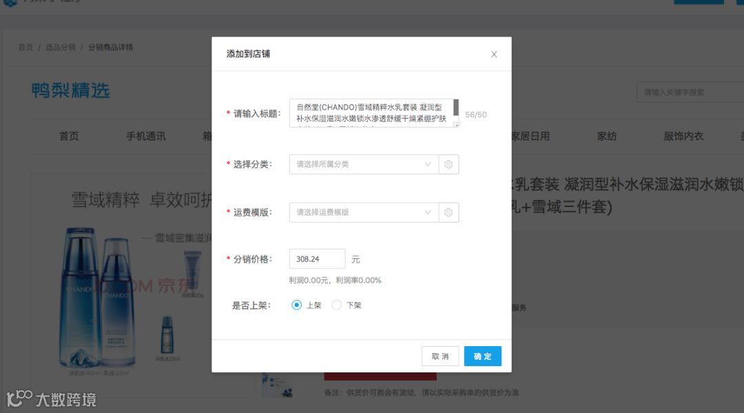 2.商家根据自己店铺的定位,合理筛选商品。进入商品详情,点击『添加到店铺』按钮,填写好相应的信息,再点击『确定』按钮即可将商品添加到店铺内。其中分销价格由商家自己决定,分销利润=分销价格-供货价。