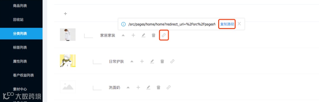 1.进入商家后台『商品-分类列表』模块,可以看到每一个分类旁边都有链接图标,点击后弹出链接内容,再点击『复制路径』将路径复制到粘贴板。
