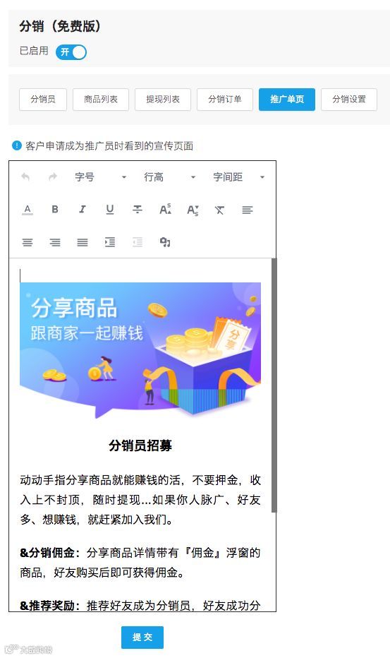 3.进入『推广单页』模块,我们为每位商家默认了一个分销员招募说明,商家可以直接使用,也可以按照自己的想法进行删改。每一位客户申请成为分销员时都会看到这个页面,商家可以充分利用此功能进行分销员的推广。