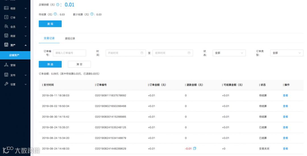 对于旗舰版小程序,可能有多个门店,为了方便门店掌握经营数据和向总店结算资金,我们在门店后台增加了『店铺资产』模块。门店可以看到自己每一笔的交易记录,以及对应记录资金的结算情况(订单过了售后时间开始结算)。