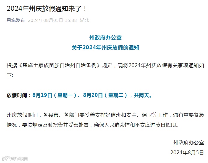 近日,湖北省恩施土家族苗族自治州微信公众号发布2024年州庆放假通知,2024年州庆放假时间为8月19日(星期一)、8月20日(星期二),共两天。加上前一周双休日,当地人可连休4天。