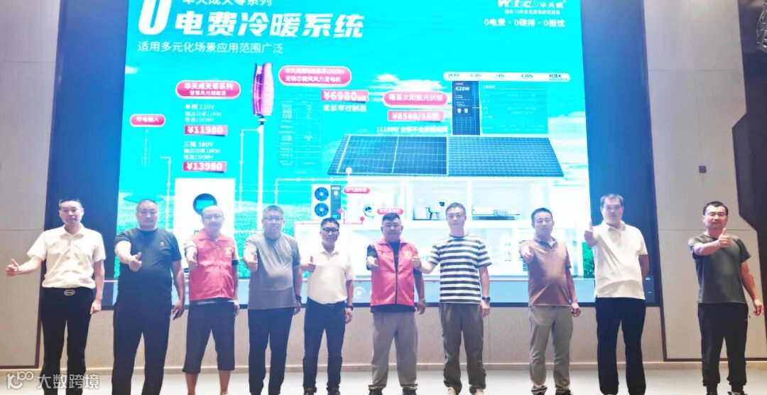 本次大会的重磅时刻当属新品发布环节。首先迎来华天成 0 电费空气能天零系列新品发布,华天成国内营销总监孙海龙、山东运营中心负责人谢总以及八位优秀经销商代表上台共同启动新品发布,引发全场热烈掌声。