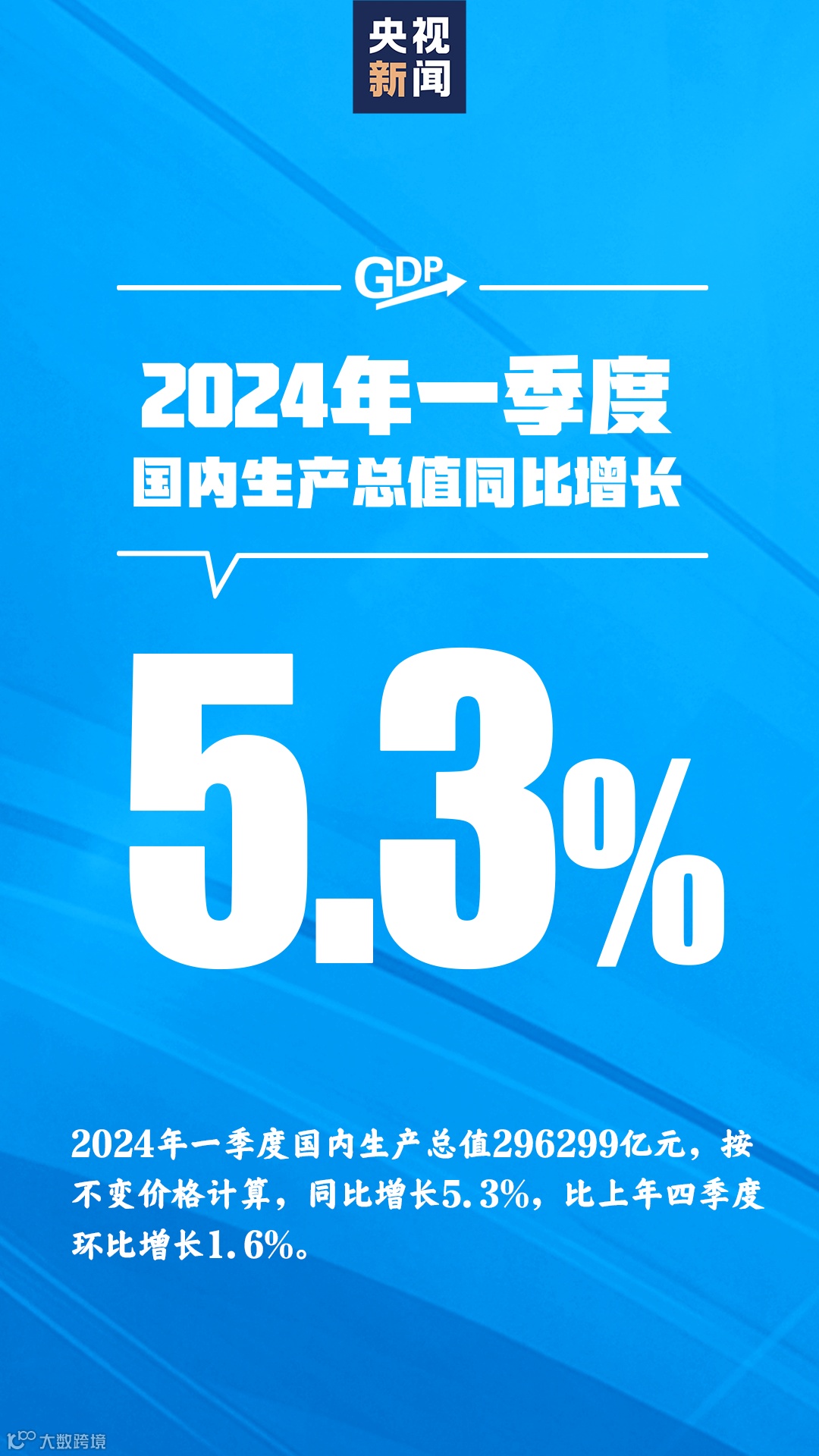 会上发布的数据显示,初步核算,一季度国内生产总值296299亿元,按不变价格计算,同比增长5.3%,比上年四季度环比增长1.6%。